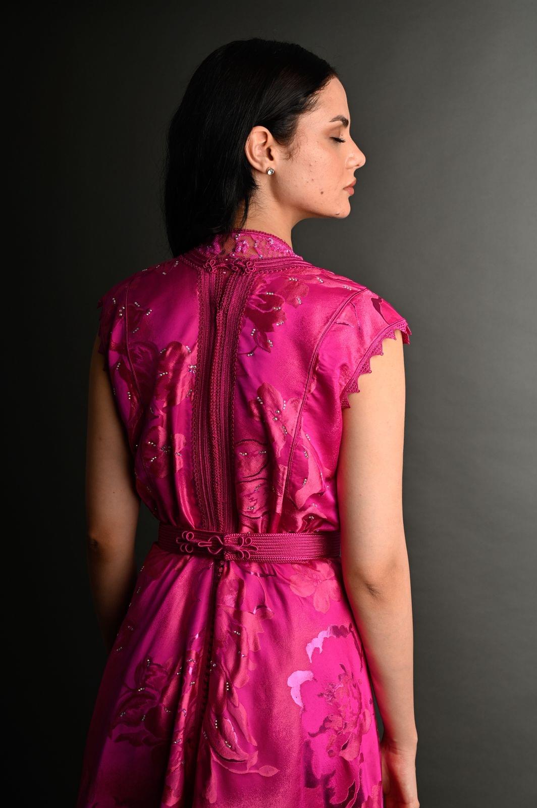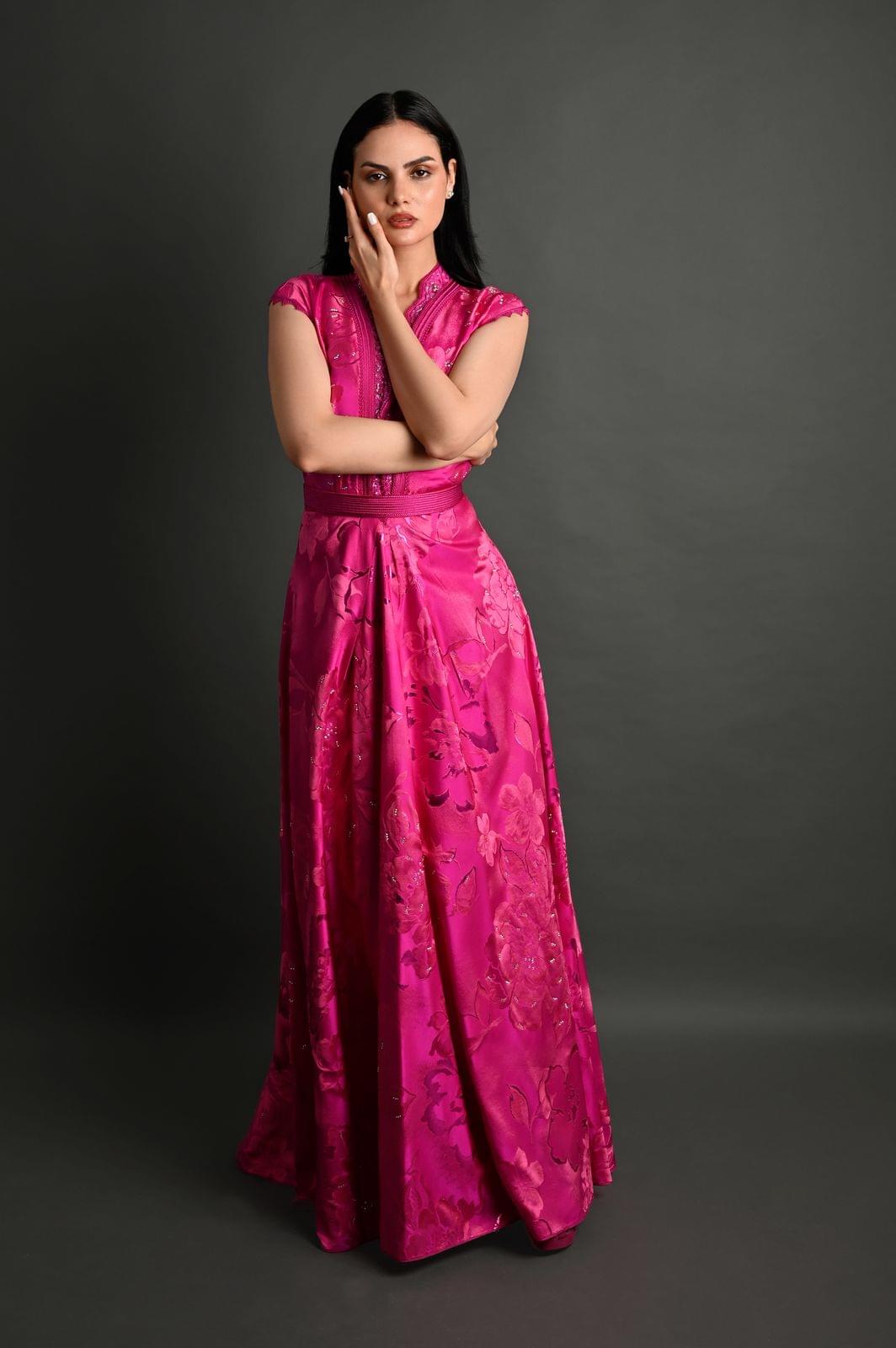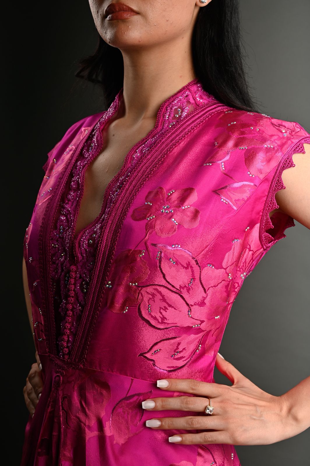 Matière : Satin jacquard avec broderies délicates.
